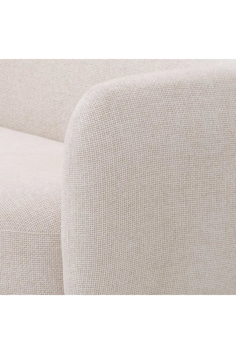 Enjoy the soft embrace of the shapely Roxy White Curved Sofa from the European brand Eichholtz. Sitting on a brushed brass base, this accent sofa features a sheltering arc from arm to back, around a circular seat. It will be a glamorous and comfortable addition to the seating area in the nook of your bedroom.